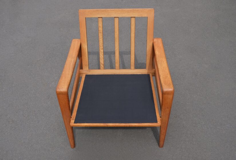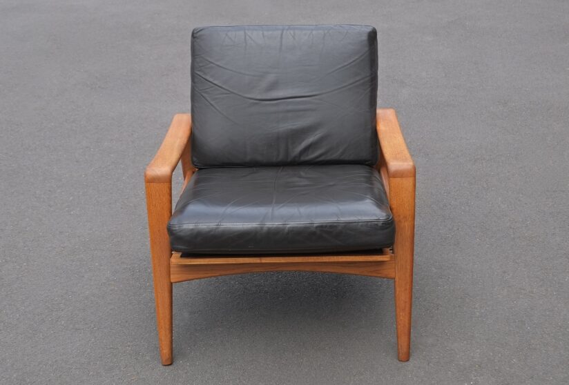 Designed by Arne Wahl Iversen and produced by Komfort, Denmark 1960’s. Solid oak framed armchairs, available singly, with the original very dark brown leather cushions. These chairs can also be re-upholstered if preferred. The seat frames have been re-webbed and covered with black fabric.