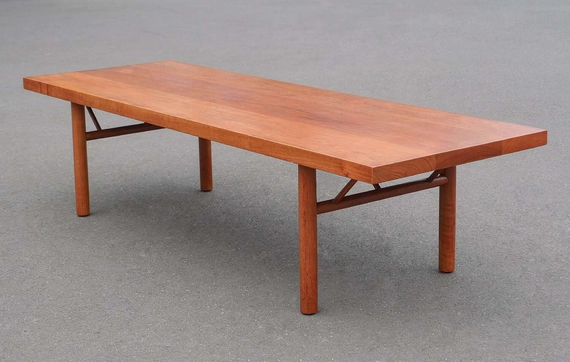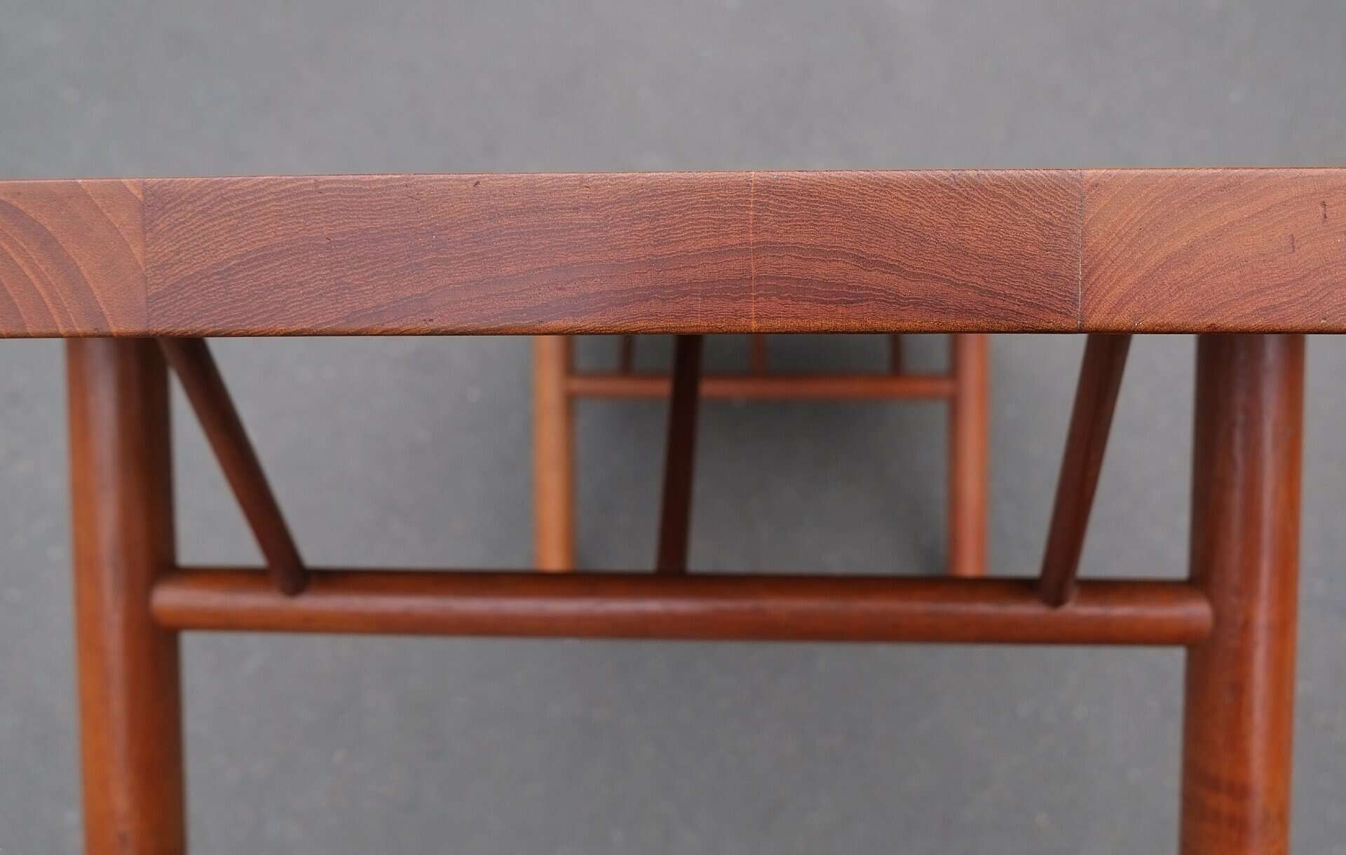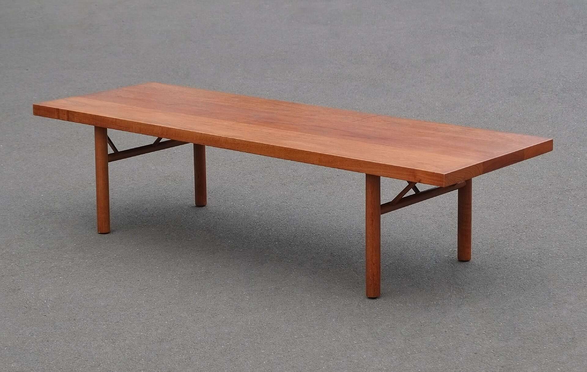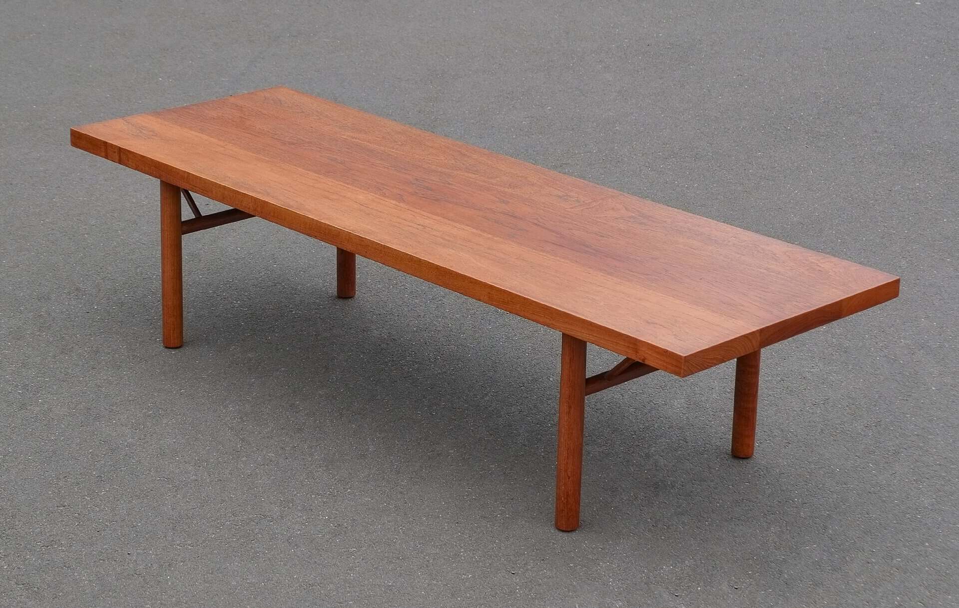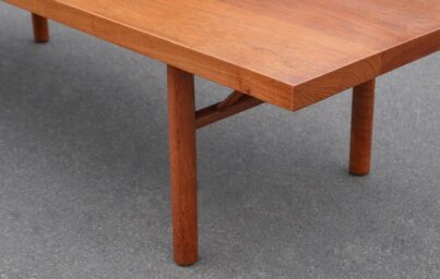 A solid teak coffee table by Gordon Russell Ltd circa 1960. The table is entirely made from nicely figured solid teak. Between each pair of legs runs a stretcher with three stays set at an angle and joining the underside of the top. At an attractive height of 37cm the table is lower than most mid-century coffee tables available.