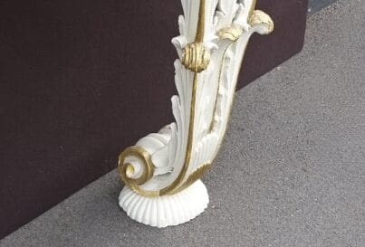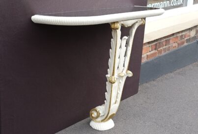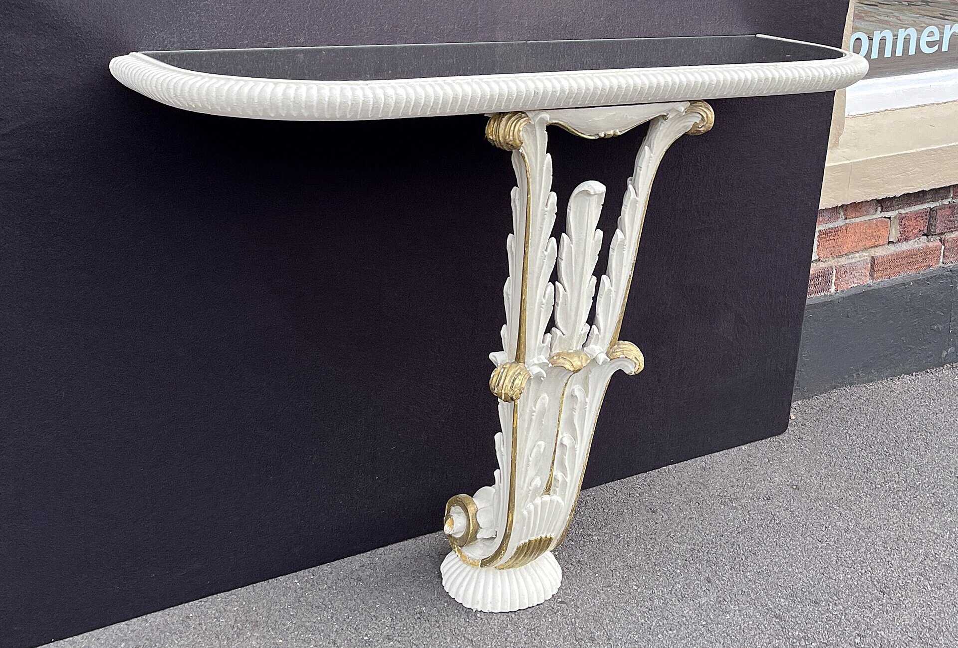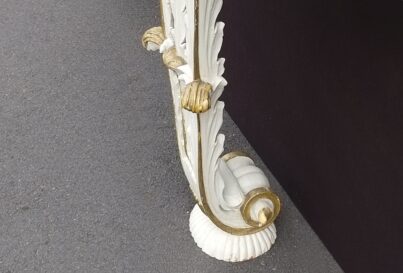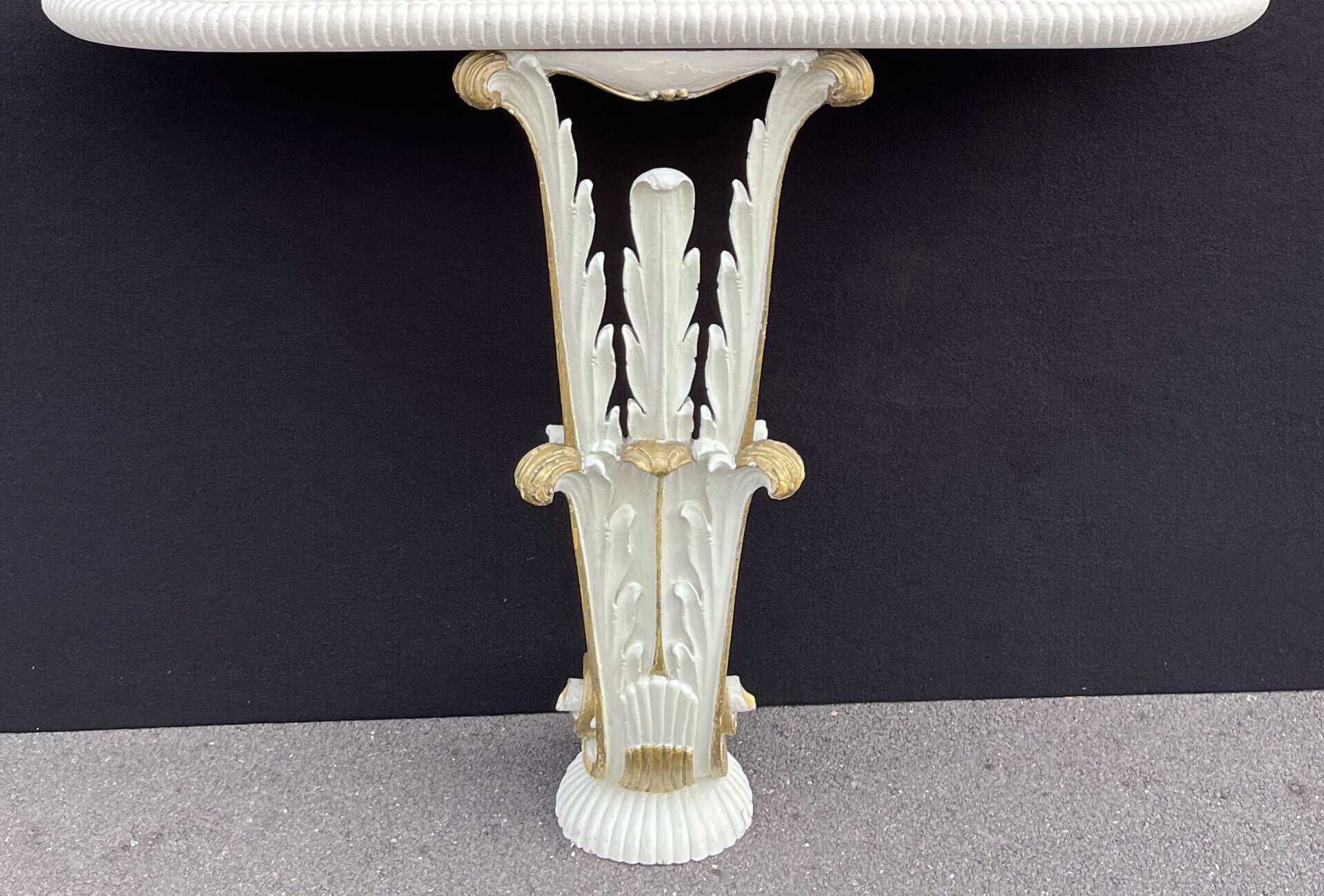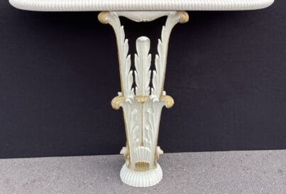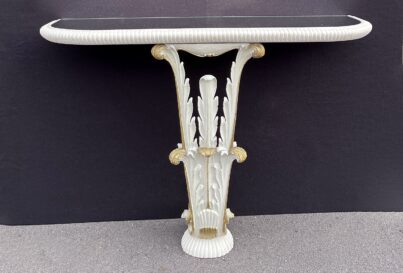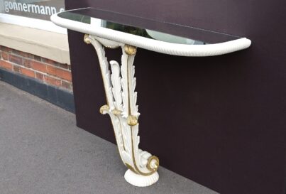 Produced by the Italian furniture manufacturer Permanente Mobili Cantu in the 1930’s/1940’s. This collective group of artisan furniture makers, from Cantu in the Lombardy region, dates back to 1893. A beautiful and elegant demi-lune console table with a single central support. The console table is carved wood with a gesso and ivory painted finish and gilded highlights. The mirror surface is in good condition but has a small chip on the back edge and some fine scratches. The top can be removed from the support for shipping.