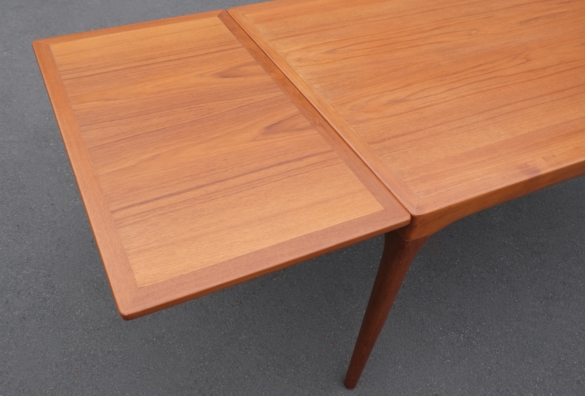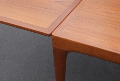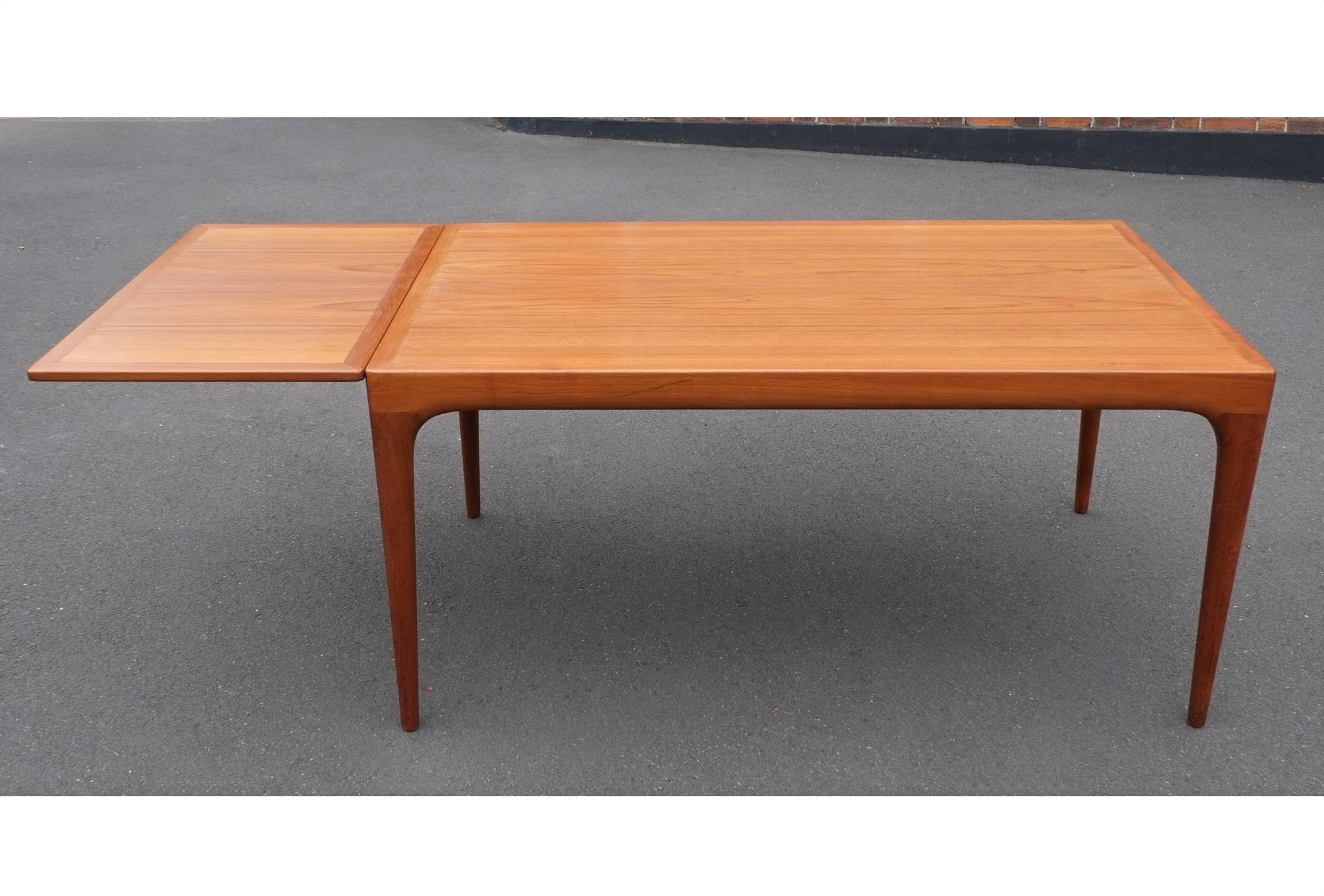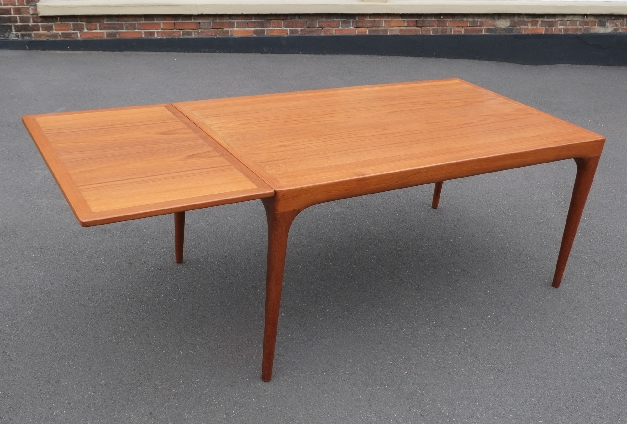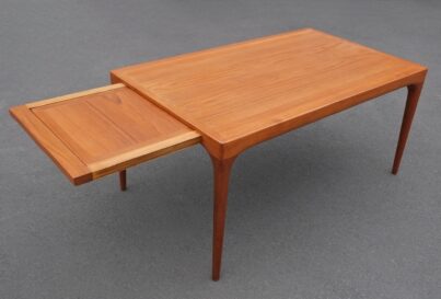 Designed by Johannes Andersen and produced by Uldum Mobelfabrik, Denmark 1960’s. A teak dining table with single extension leaf cleverly stored under the table and accessed from one end on a pull out shelf that fits flush with the table frame. The table is beautifully made with no hard edges and legs that are cleverly jointed so that they run seamlessly into the table frame and top in one continuous line. For delivery it is possible to remove the legs.