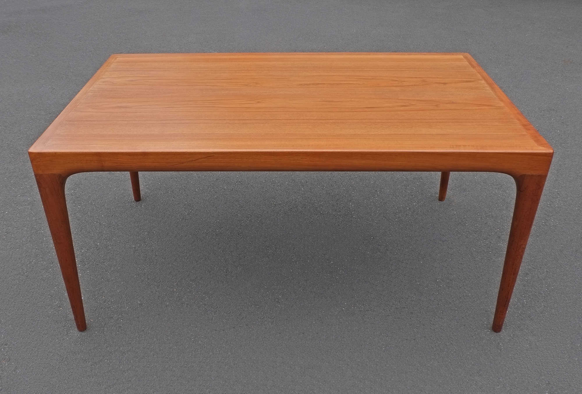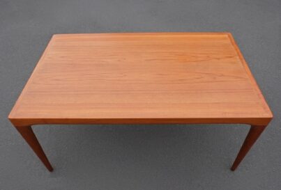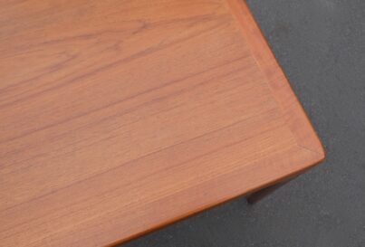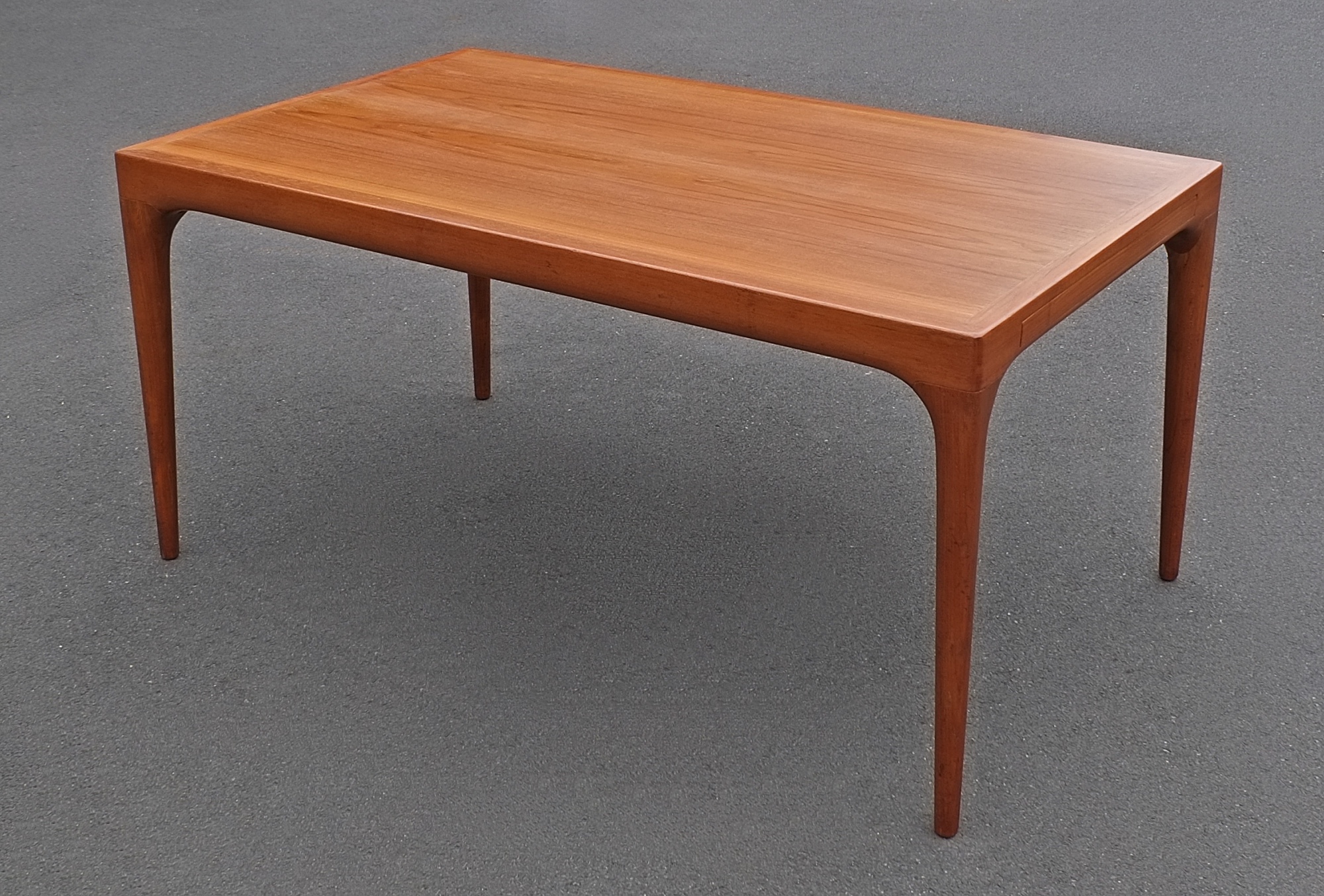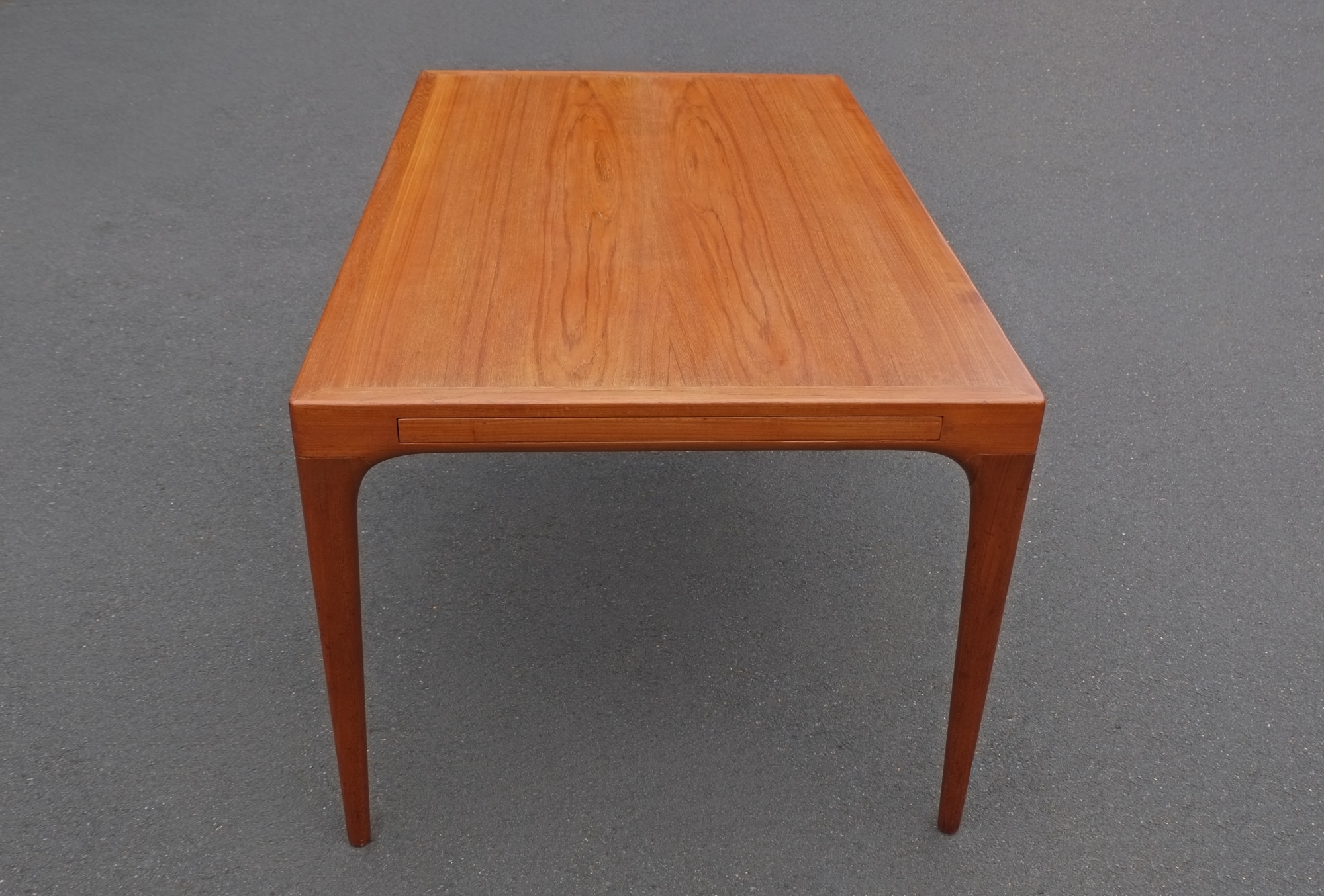 Designed by Johannes Andersen and produced by Uldum Mobelfabrik, Denmark 1960’s. A teak dining table with single extension leaf cleverly stored under the table and accessed from one end on a pull out shelf that fits flush with the table frame. The table is beautifully made with no hard edges and legs that are cleverly jointed so that they run seamlessly into the table frame and top in one continuous line. For delivery it is possible to remove the legs.