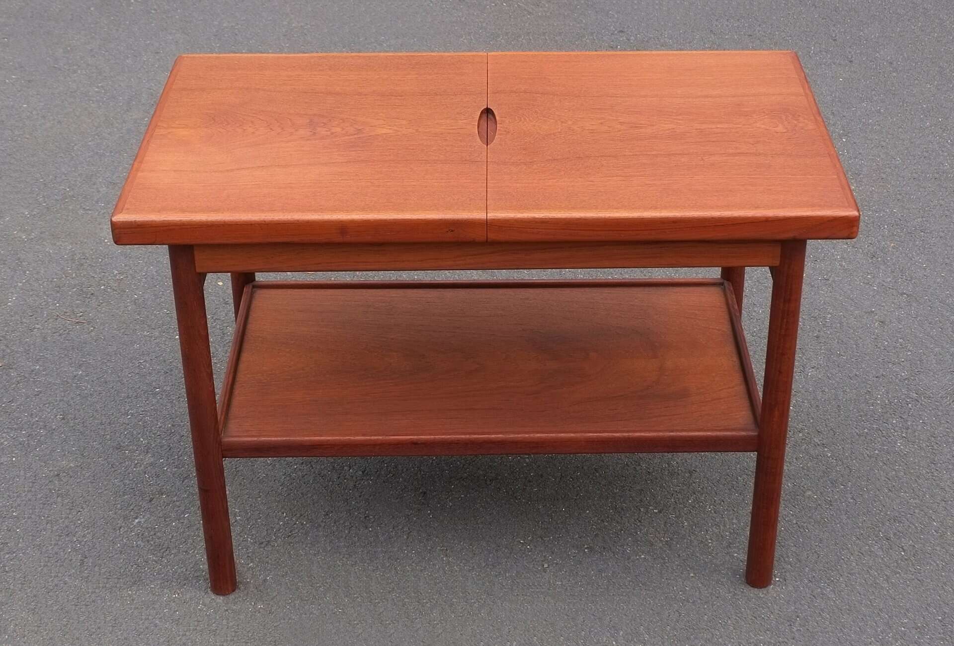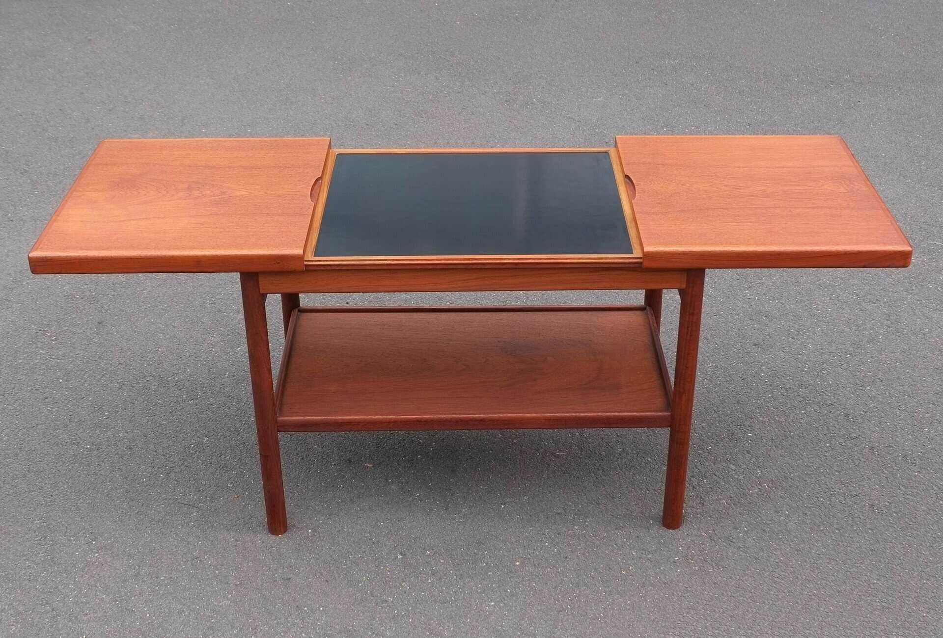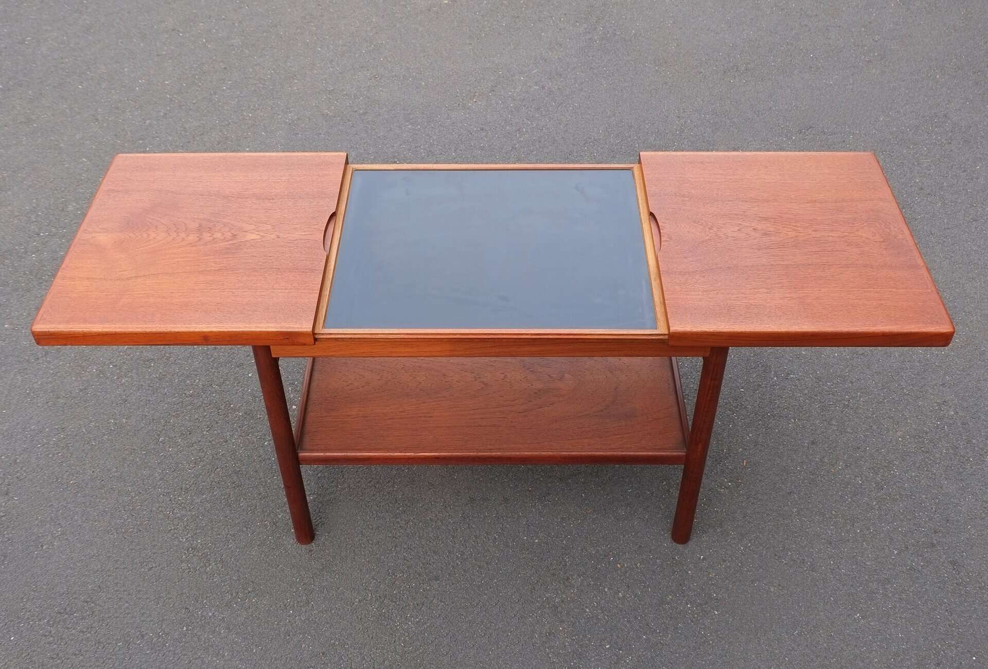 Designed by Kurt Østervig and manufactured by Jason Mobler, Denmark 1960’s. A two tier teak side table with sliding top which extends from either side to reveal a central black melamine surface that is ideal for serving drinks from.