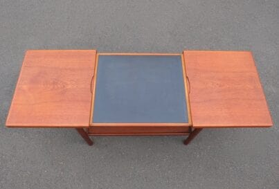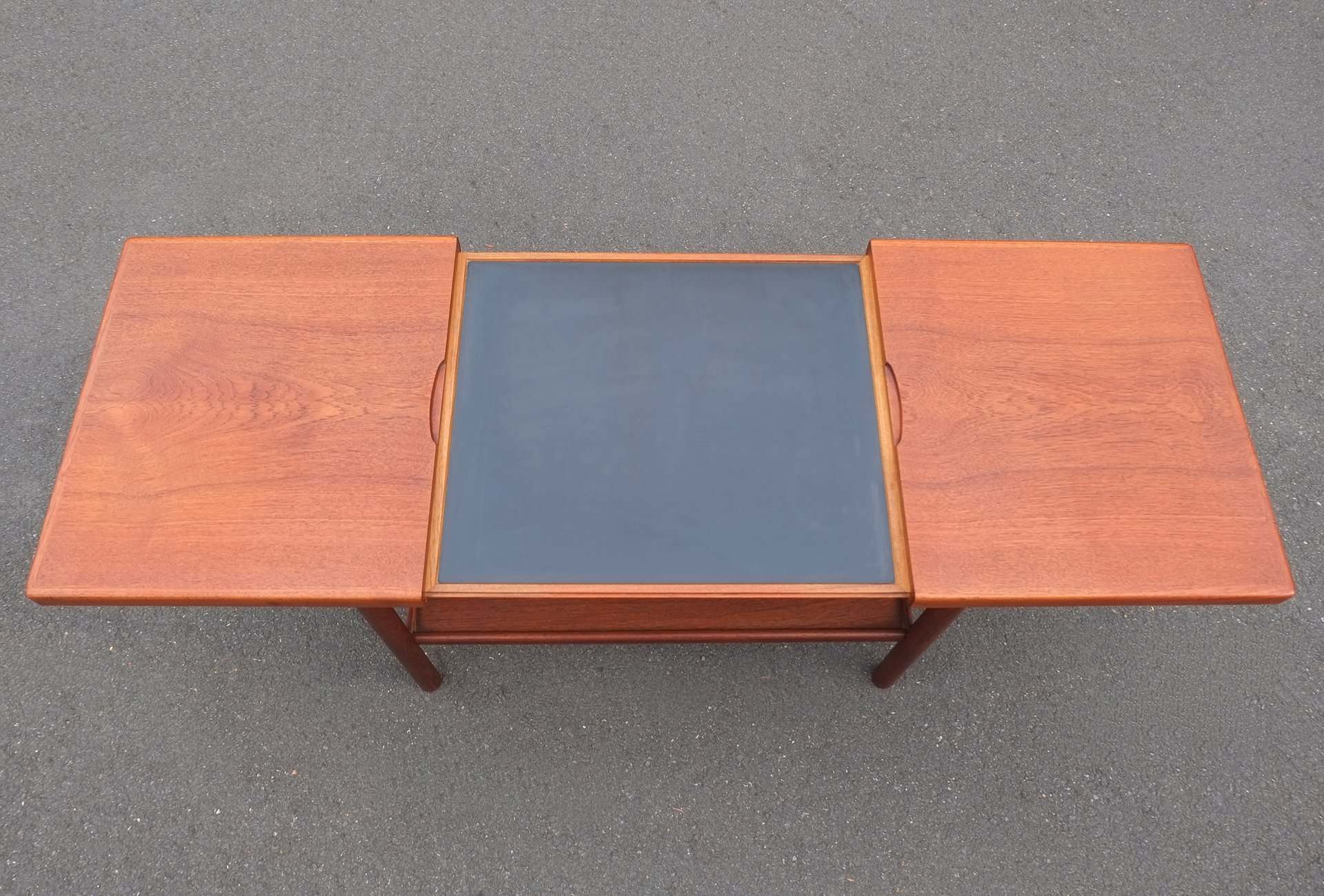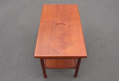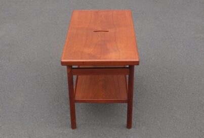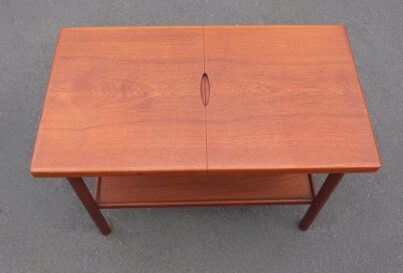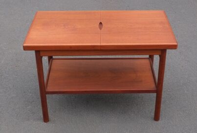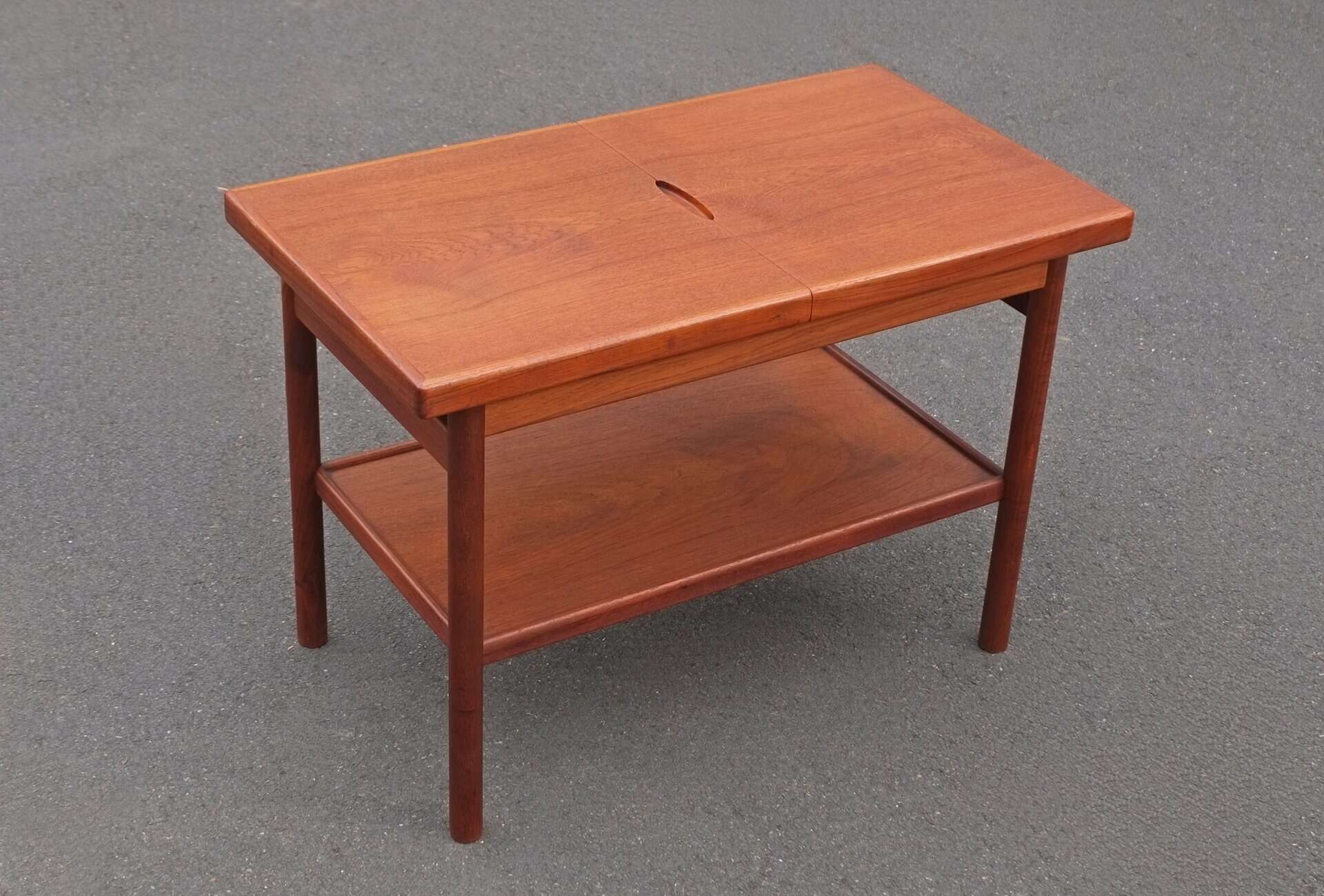 Designed by Kurt Østervig and manufactured by Jason Mobler, Denmark 1960’s. A two tier teak side table with sliding top which extends from either side to reveal a central black melamine surface that is ideal for serving drinks from.
